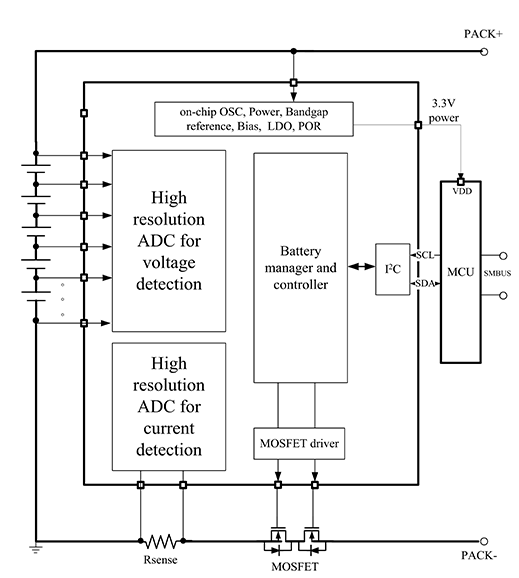 HSM12X0 系列芯片可作為3-15 節(jié)串聯(lián)電池組監(jiān)控和保護解決方案的一部分。通過I2C 通信,MCU 可以使用HSM12X0 來執(zhí)行電池管理功能,例如監(jiān)測(電池電壓、電池組電流、電池組溫度)、保護(控制充電/放電FET)以及電池組均衡功能等。集成的模數(shù)轉(zhuǎn)換器可實現(xiàn)MCU 對電池組關(guān)鍵參數(shù)(電壓、電流以及溫度)的純數(shù)字讀取,這些參數(shù)的校準在制造過程中處理。HSM12X0 在設(shè)計時充分考慮了低功耗要求,既可通過使能/禁用集成電路IC 中的子模塊來控制整個芯片的功耗,又可以利用SHIP 模式將電池組切換至超低功耗狀態(tài)。