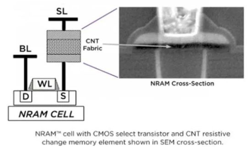 Nantero公司已經(jīng)花費了將近20年的時間來研究NRAM,該技術(shù)基于排列在交叉點電極之間的薄層中的無規(guī)組織的碳納米管的漿料。當(dāng)施加電壓時,CNT被拉到一起,接觸點數(shù)量的增加減少了電極之間的電阻路徑。這種連接是由范德華力在原子級上保持的。為了復(fù)位存儲單元,電壓脈沖會引起熱振動來斷開這些連接。