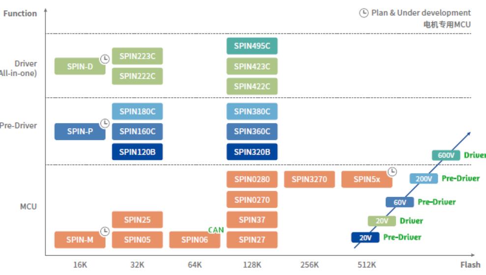 MM32SPIN是電機(jī)與電源相關(guān)應(yīng)用設(shè)計(jì)的專(zhuān)用產(chǎn)品家族,使用高性能ArmCortex-M0與ArmCortex-M3內(nèi)核,依據(jù)功能區(qū)分成專(zhuān)用MCU與驅(qū)動(dòng)MCU兩種。MM32SPIN系列最高提供了128KB Flash,內(nèi)置了多路UART、I2C、SPI、CAN以及多種高精度模擬外設(shè),包括:比較器、12位3MspsADC與運(yùn)算放大器。驅(qū)動(dòng)MCU提供了集成電源的功能,預(yù)驅(qū)、LDO以及MOSFET等豐富的外設(shè),規(guī)劃的電壓范圍有20V、60V、200V以及600V,產(chǎn)品豐富且應(yīng)用涵蓋廣泛??偞碛⑸形⑻峁╅_(kāi)發(fā)板測(cè)試及例程支持。