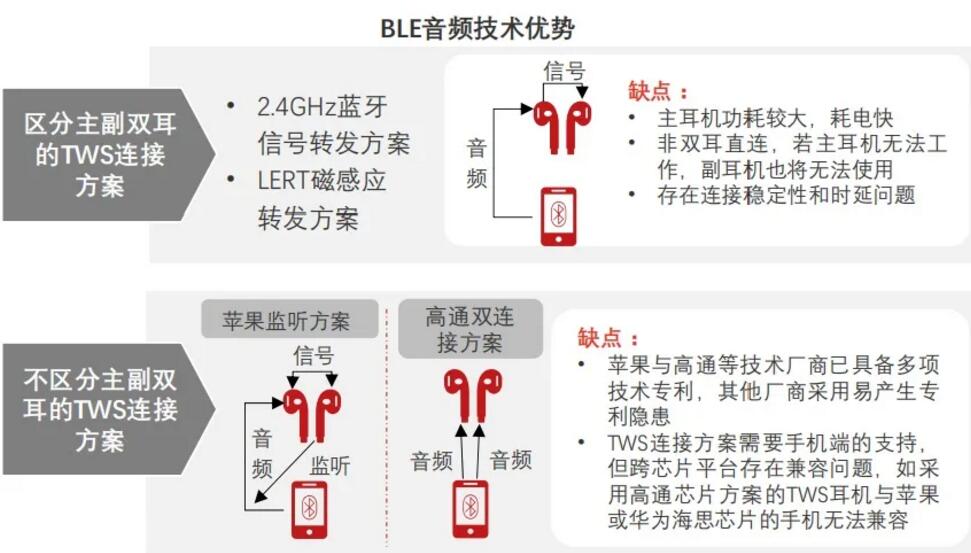 藍(lán)牙芯片的重要應(yīng)用場景。早期藍(lán)牙標(biāo)準(zhǔn)不支持無線多路直連,無法實現(xiàn)雙耳同步傳輸,普通藍(lán)牙耳機僅能實現(xiàn)一對一連接,蘋果采用Snoop監(jiān)聽模式,在一只耳機進(jìn)行藍(lán)牙音頻傳輸時,另一只耳機利用它們之間的私有協(xié)議對其進(jìn)行監(jiān)聽,達(dá)到1對2連接的目的。由于蘋果對監(jiān)聽模式進(jìn)行專利封鎖,早期安卓TWS廠商主要采用relay轉(zhuǎn)發(fā)模式,將音頻從手機傳至左耳設(shè)備,再由左耳轉(zhuǎn)發(fā)至右耳,但該方案存在諸多劣勢,例如(1)音頻傳輸過程較長造成連接不穩(wěn)定;(2)延遲問題嚴(yán)重;(3)接受音頻傳輸?shù)闹饔枚鷻C的電池功耗顯著高于輔用耳機。安卓TWS廠商受限于技術(shù)實力,TWS耳機產(chǎn)品音頻傳輸體驗亟待提升。