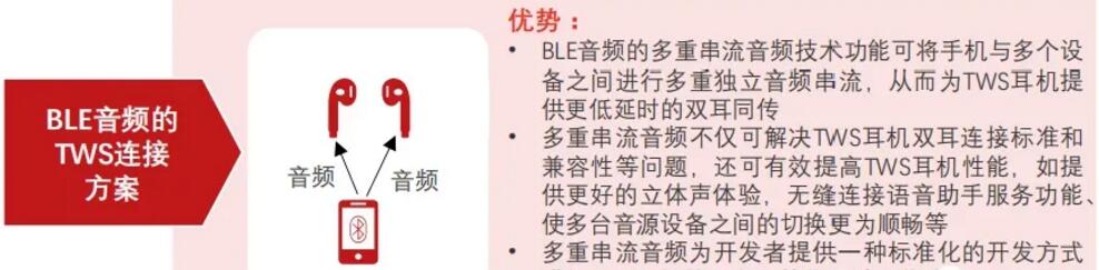 BLEA標(biāo)準(zhǔn)采用多重串流音頻技術(shù),可實現(xiàn)無線多路直聯(lián),單一音頻輸出設(shè)備與一個或多個音頻接收設(shè)備之間,可同步進(jìn)行多重且獨立的音頻串流傳輸。BLEA標(biāo)準(zhǔn)的頒布打破蘋果TWS專利封鎖,解決TWS耳機雙耳直連的標(biāo)準(zhǔn)問題和兼容性問題,為安卓TWS廠商提供標(biāo)準(zhǔn)化的TWS耳機開發(fā)方式,有助于釋放安卓TWS廠商的生產(chǎn)力。
