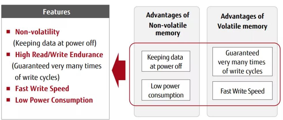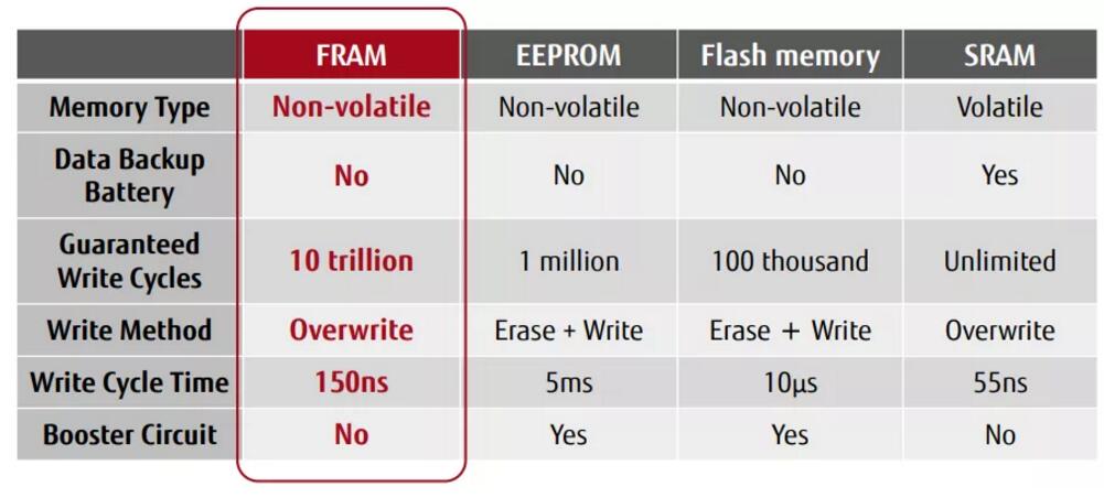 獨(dú)特性能成就技術(shù)“硬核”,F(xiàn)RAM是存儲(chǔ)界的實(shí)力派。除非易失性以外,F(xiàn)RAM還具備三大主要優(yōu)勢:高讀寫入耐久性、高速寫入以及低功耗,這是絕大多數(shù)同類型存儲(chǔ)器無法比擬的。