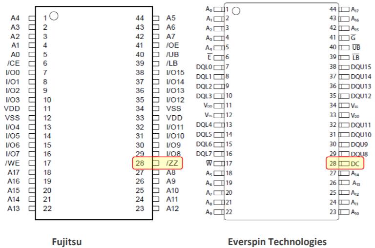 MRAM,組織為256kx16,由標(biāo)稱3.3V電源供電,并與FRAM兼容。兩款產(chǎn)品均使用標(biāo)準(zhǔn)SRAM并行地址(A0-16)、字節(jié)寬雙向數(shù)據(jù)引腳(DQ0-7)和控制信號(/E、/W、/G)。每個(gè)都可以由一個(gè)公共定時(shí)接口支持,并將用作隨機(jī)存取讀/寫存儲(chǔ)器,在斷電時(shí)無需外部電池即可保留數(shù)據(jù)。Everspin不支持/ZZ睡眠功能。/ZZ可能需要上拉。