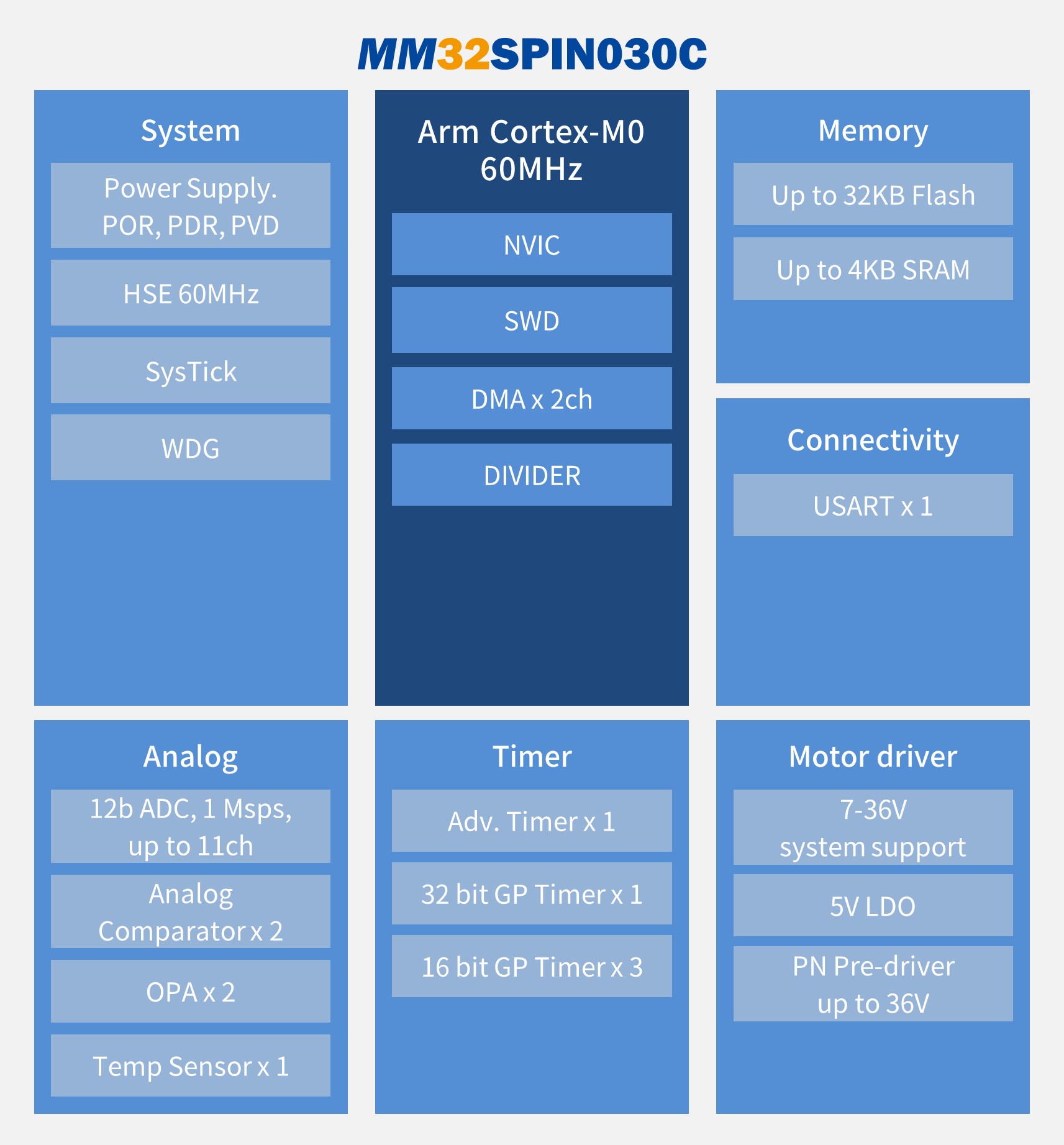 MM32SPIN030C是一款高性能單片機(jī)電機(jī)控制SOC產(chǎn)品,選用Cortex-M0內(nèi)核,配備了電機(jī)控制所需的專用模擬外設(shè),包括12位高精度ADC、COMP2路模擬比較器、OPAMP2路運(yùn)算放大器、三相P/N格柵極驅(qū)動(dòng)器,配備MC-TIM、硬件除法器HW-Div、DMA控制器等專用資源,及其32KB Flash、4KBSRAM、高主頻60mHz、17個(gè)GPIO、LDO等基礎(chǔ)資源。封裝采用TSSOP28和QFN28。