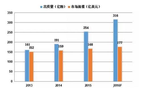 IC Insights研究報告顯示,2015年全球MCU市場規(guī)模達到168億美元,較去年增長5.6%,出貨量255億顆比去年提升12.4%,預(yù)計2016年全球MCU市場出貨量將突破300億顆大關(guān)。其中,2015年全球32位MCU出貨量超過4/8位MCU與16位MCU出貨量的總和,而且未來幾年應(yīng)該會保持30%左右的高速增長的水平。