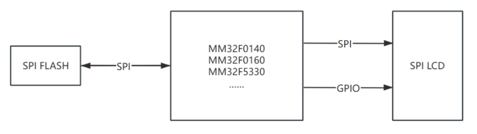 靈動微推出的SPI LCD顯示參考方案,通過SPI接口讀取外部SPI FLASH存儲芯片中存儲的字體、圖片等數(shù)據(jù)資源,再通過另外一路SPI驅動SPI LCD彩屏顯示。對于不同尺寸、不同分辨率的 SPI LCD 彩屏,客戶可以選擇靈動微電子不同規(guī)格的MCU來實現(xiàn)刷屏效果,硬件設計框圖如下所示: