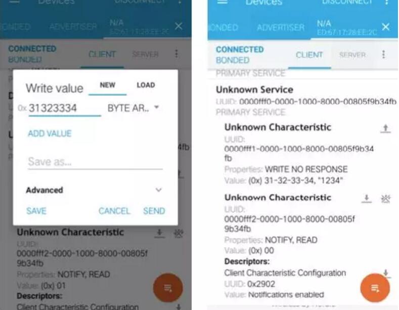 連接成功后,對(duì)UUID為fff1的特征值寫0x31323334(模擬用戶輸入密碼”1234”),測(cè)試板上連接的馬達(dá)開始轉(zhuǎn)動(dòng),執(zhí)行開鎖動(dòng)作;