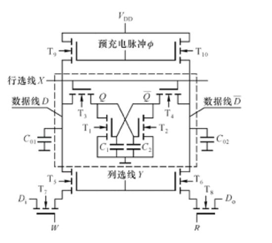 補充充電的過程:加預充電脈沖∅、預充電管T9、T10導電,CO1,C02很快充電至VDD,∅撤銷后,CO1,CO2上的電荷保持。然而進行讀出操作:地址有效,行、列選線X、Y高電平;R=1,W=0進行讀出操作,如果原信息為Q=“1”,說明MOS電容C2有電荷,C1沒有電荷(即T2導電,T1截止);這時CO1上的電荷將對C2補充充電,而CO2上的電荷經(jīng)T2導電管放掉,結果對C2實現(xiàn)了補充充電。讀出的數(shù)據(jù)仍為,