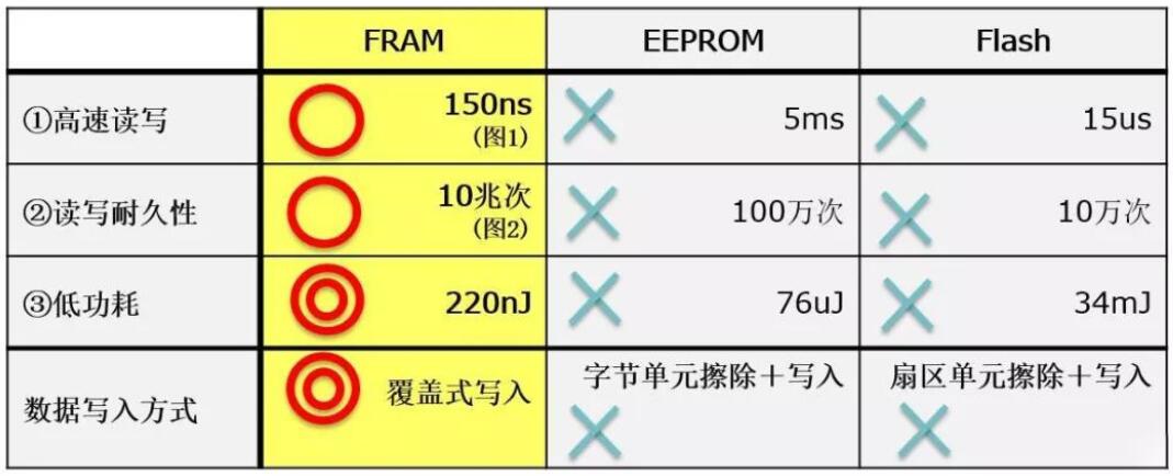 富士通FRAM主要具備三大優(yōu)勢:高讀寫入耐久性、高速寫入以及低功耗,這是絕大多數(shù)同類型存儲器無法比擬的。比如FRAM寫入次數(shù)壽命高達(dá)10萬億次,而EEPROM僅有百萬次(10^6)。