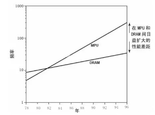 芯片集成度的不斷提升,給分立存儲(chǔ)器帶來(lái)了兩大挑戰(zhàn):首先:集成度和工藝開始允許片內(nèi)集成更多的存儲(chǔ)器;其次,存儲(chǔ)器的速度發(fā)展遠(yuǎn)遠(yuǎn)趕不上于MPU的速度,MPU速度以每年60%在成長(zhǎng),而存儲(chǔ)器只有10%。二者速度之間增長(zhǎng)的差異巨大,如下圖所示。