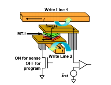 實現(xiàn)MRAM可靠存儲的一個主要障礙是高位干擾率。對目標位進行編程時,非目標位中的自由層會被誤編程。目前飛思卡爾半導體研究人員已經(jīng)成功解決了此問題,其方法是,在每次出現(xiàn)位狀態(tài)空翻時,產(chǎn)生一個跳變位,它將磁矩的方向旋轉(zhuǎn)到同一方向。寫入線1和寫入線2上的反轉(zhuǎn)脈沖電流使極性旋轉(zhuǎn),從而不會干擾相同行或列的其它位元。