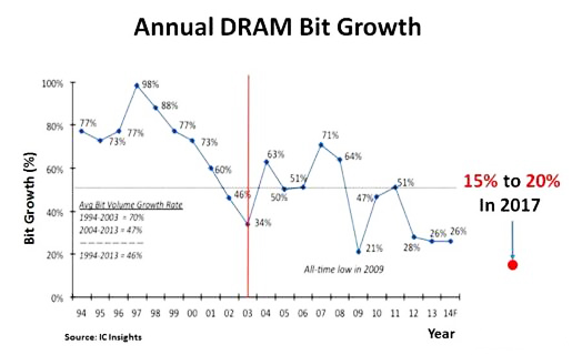 美光(Micron)表示,2017年DRAM供給位元預計成長15-20%,可說是近20年來最低的位元成長率(bit growth)。如此低的位元成長率,主要是因為DRAM微縮限制。市場上有很長一段時間都沒有任何有關(guān)DRAM微縮的消息了。當供給位元成長低于45%時,這時就是賣方的市場了。因此,DRAM的寡頭壟斷、低位元成長率,以及制造擴張遲緩,導致長期的供應吃緊。最終的局面可能就是DRAM的價格不斷上漲,而供應面卻不會有任何改變。
