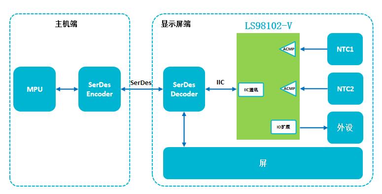 現(xiàn)場可重構(gòu)IC LS98102/-V采用QFN14封裝(車規(guī)級(jí)),供電范圍2.3V~5.5V,靜態(tài)電流100nA,12個(gè)可任意配置GPIO。該器件具有監(jiān)控2路NTC的溫度,溫度異常時(shí)發(fā)出中斷給SerDes端,主機(jī)控制發(fā)出關(guān)屏等指令信息擴(kuò)展GPIO口,用于控制顯示屏端其他外設(shè)。