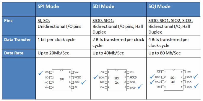 SQI模式下,全部4個(gè)引腳(引腳2、4、5和7)均配置為可隨時(shí)高效進(jìn)行讀或?qū)懖僮?,確保在一個(gè)時(shí)鐘周期內(nèi)通過(guò)總線傳輸4位,這實(shí)際上會(huì)獲得4倍數(shù)據(jù)速率。例如,標(biāo)準(zhǔn)SPI模式下需花費(fèi)40個(gè)時(shí)鐘周期才能完成的任務(wù)現(xiàn)在可以在40/4 = 10個(gè)時(shí)鐘周期內(nèi)完成。 需要快速傳輸大量數(shù)據(jù)時(shí),該功能十分有用。